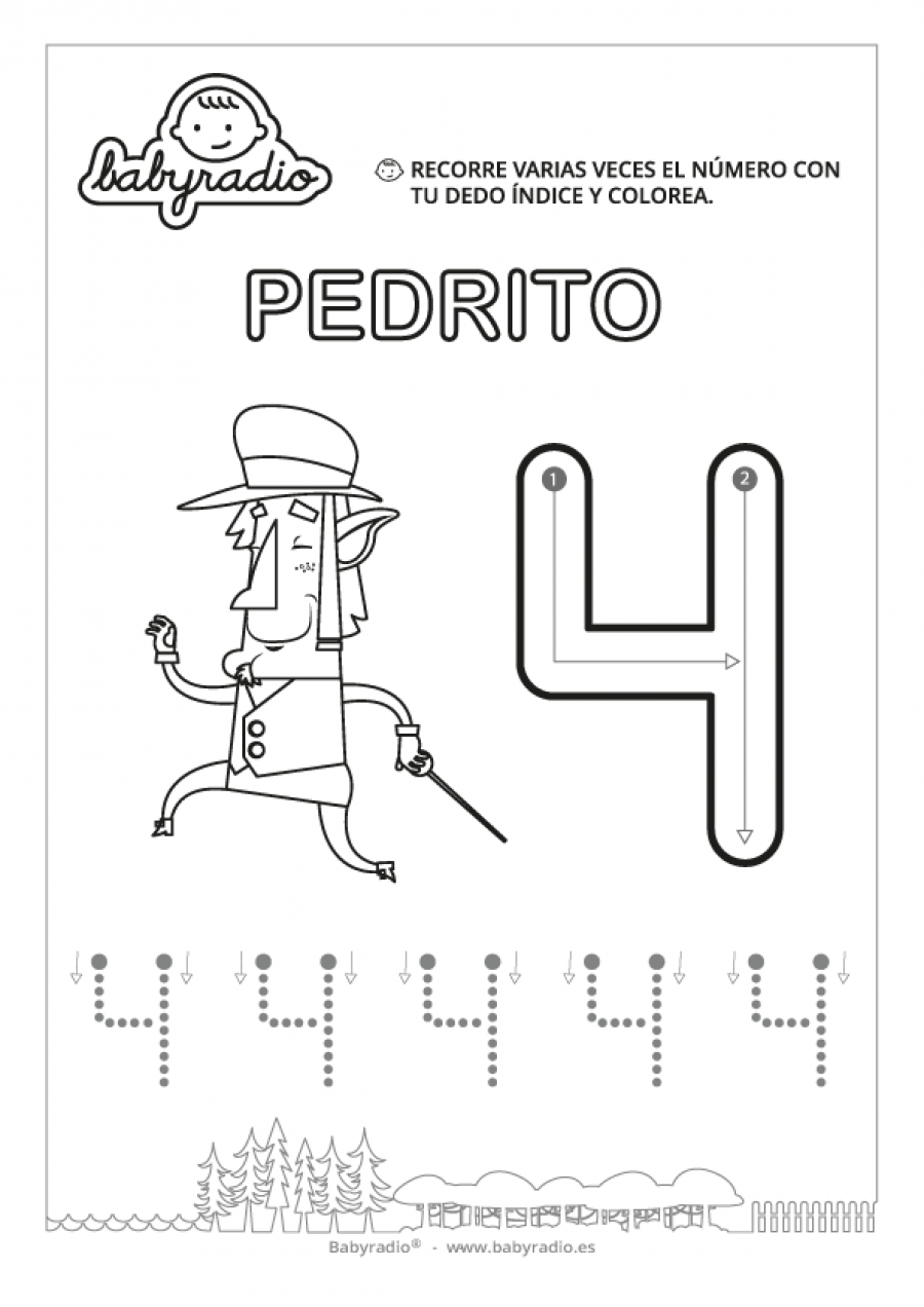 RECORRE CON EL DUENDE PEDRITO EL NÚMERO 4 VARIAS VECES CON EL DEDO Y COLOREA.